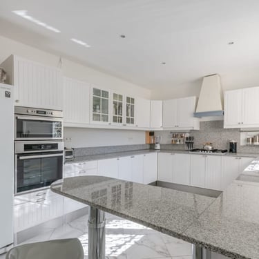 Sous-sol : salle de réception, cuisine, buanderie, salle d’eau avec WC, garage double.